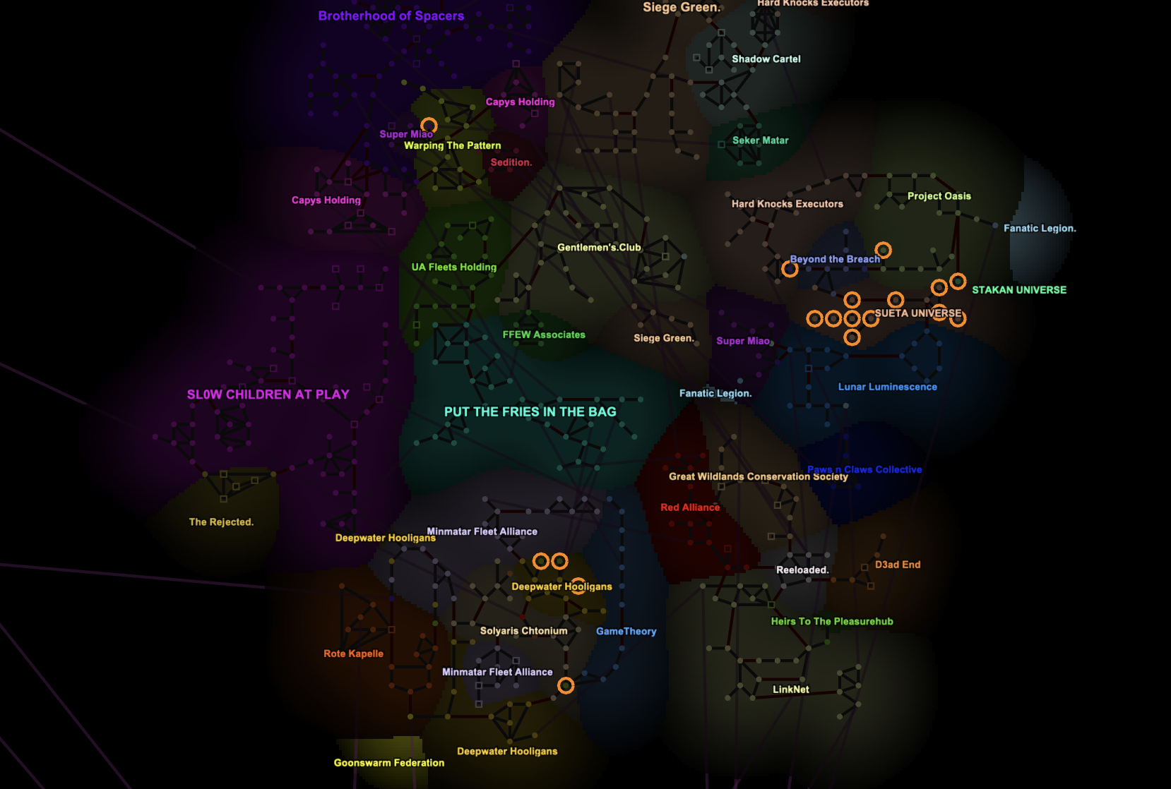 Goonswarm Federation (479)多国籍。2006年設立、EVE最大アライアンス。Imperium連合盟主。SomethingAwfulフォーラム起源。現在はInsmother中心に北部を睨む。