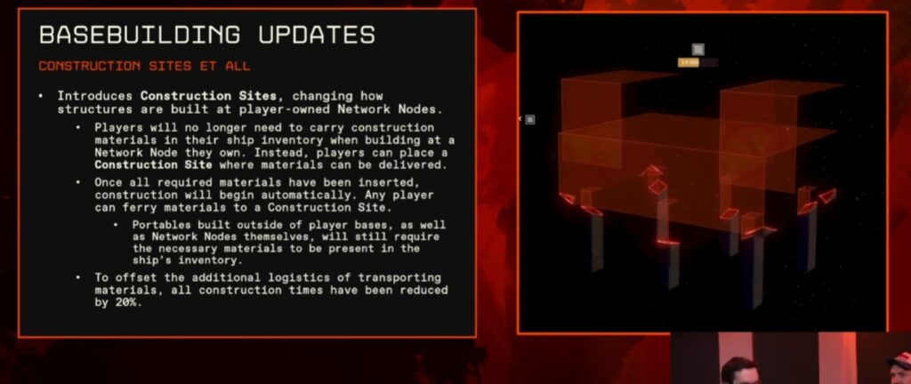 この変更に伴い、全ストラクチャの建設時間が20%短縮された。なお、フィールドで展開するポータブル・ストラクチャ(フィールドストラクチャ)については、従来通りカーゴホールドに素材を持っている必要がある。