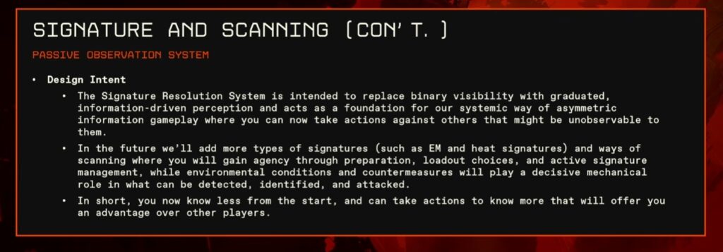 • 情報の劣化:シグネチャは一度解析しても、視線を外すと時間とともに情報が失われる。静止物(小惑星など)は同じ位置に留まるため再解析が速いが、移動するNPCなどはトラッキングが困難になる