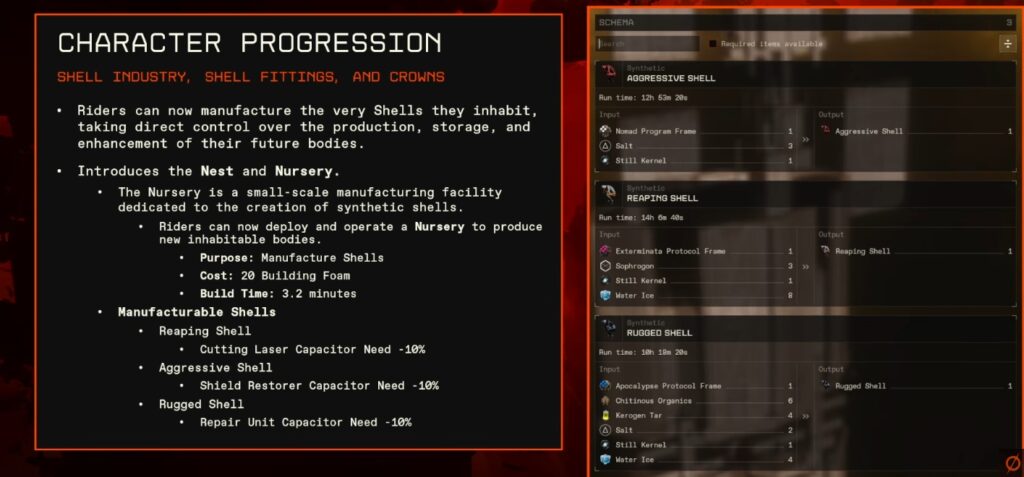 • ナーサリー(Nursery):シェルの製造施設。アグレッシブ・シェル、リーピング・シェル、ラグド・シェルの3種が最初の製造可能シェルとして登場。製造には素材と時間(例:10時間)が必要