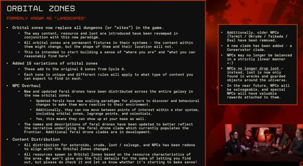 • NPCからの直接ルートドロップは廃止:代わりに、宇宙空間の残骸(レック)やリソースキャッシュからルートを入手する。NPCはそれらを守護する存在として機能